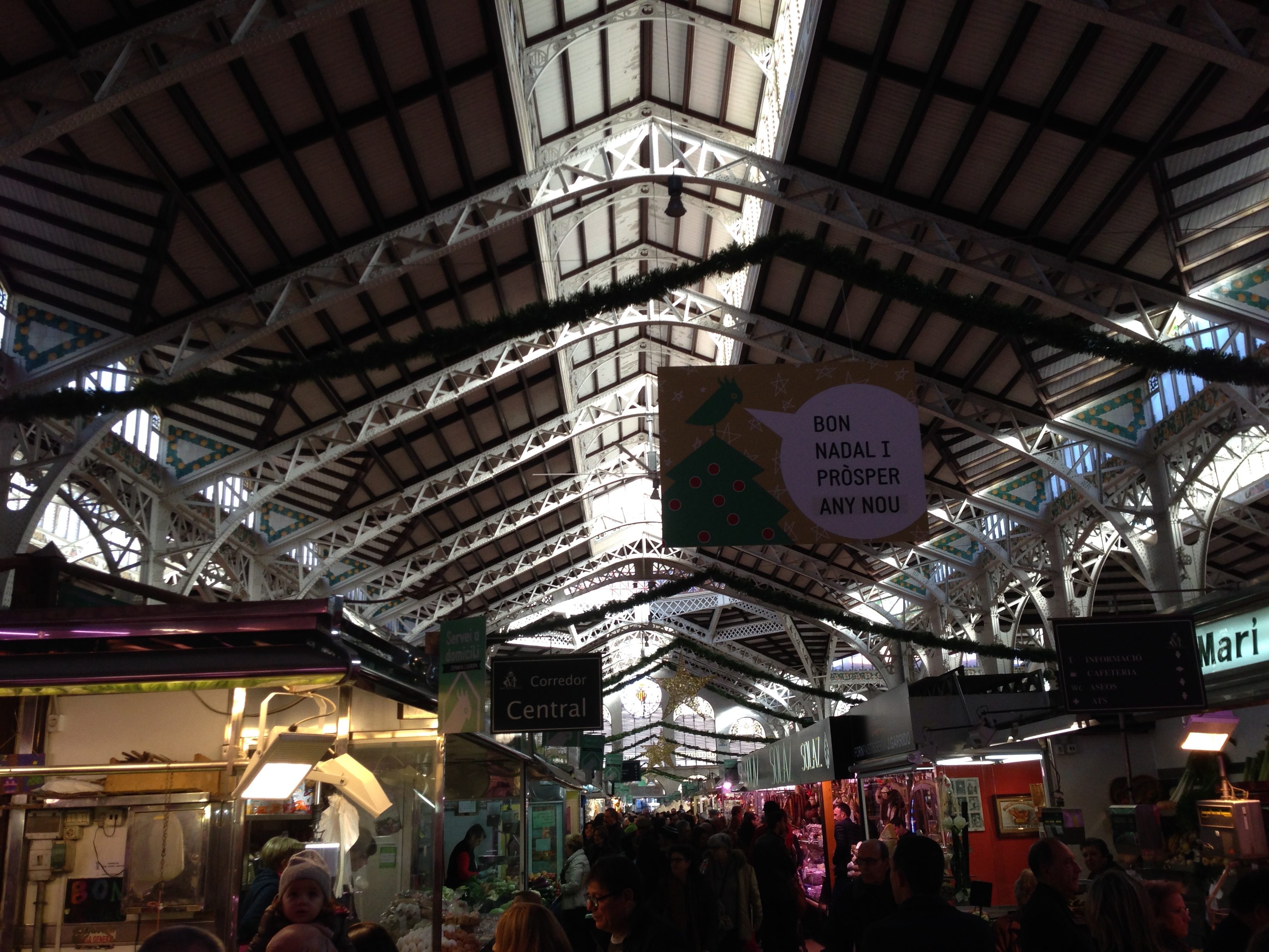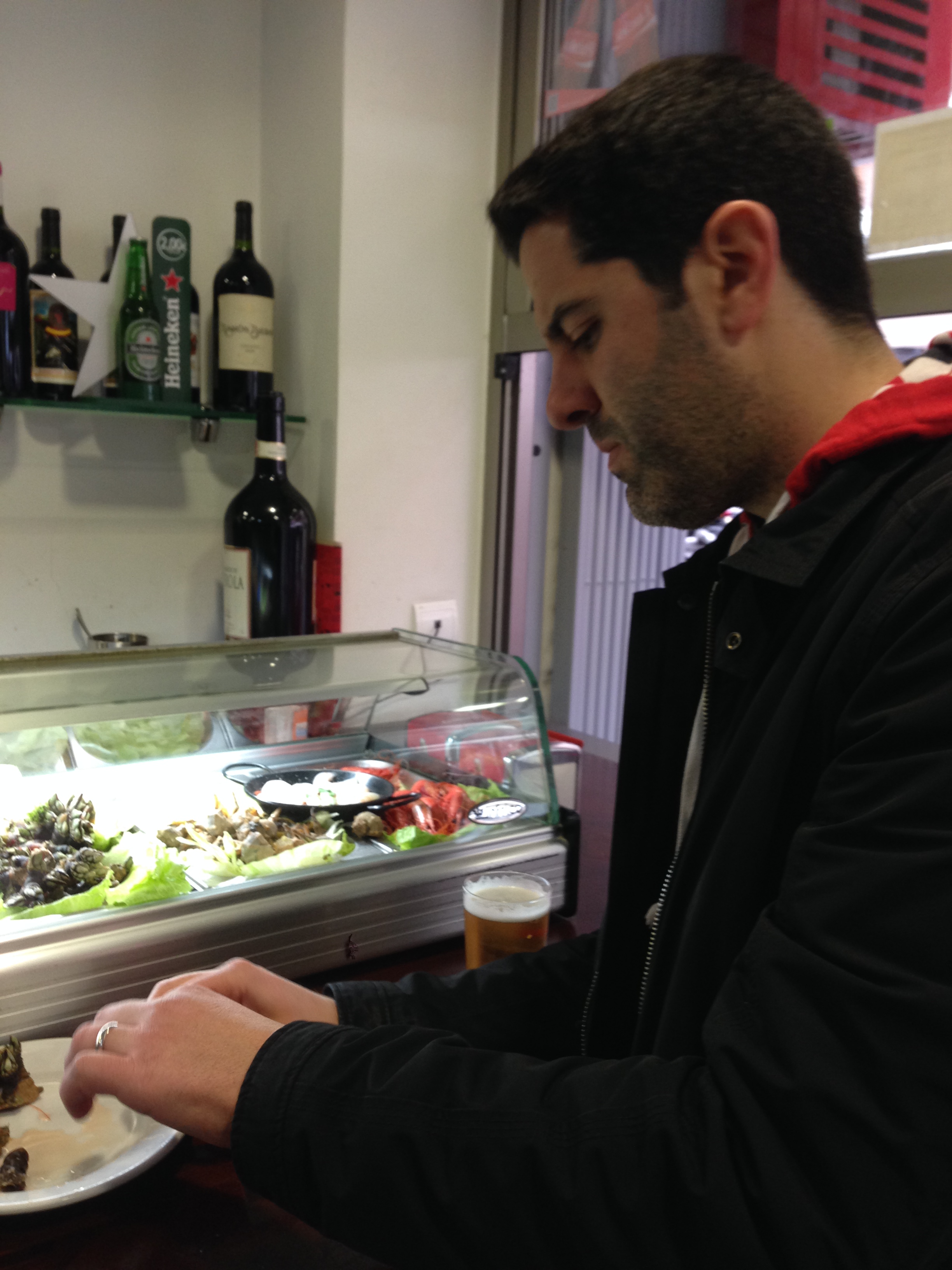 Nos bajamos donde empezamos, en la Plaza Catalunya y se nos ocurrió buscar un lugar para comer pastas. Había mucha hambre y teníamos mucho tiempo sin comer comida italiana así que consulté mis libros y fuimos en búsqueda de un restaurante italiano. Cuando por fin llegamos, estaba cerrado! La amargazón pegó, y el cerebro no comenzó a funcionar bien y terminé escogiendo un pequeño lugar que estaba cerca que se llamaba El Bitxo! Y vaya bicho raro fue eso! Jajaja Era un lugar bien pequeño y cuando entramos super bien, un menú extenso y el dueño muy amable. Pero cuando fui al baño y veo que su cocina solo contaba con un microondas, ya la cosa empezó a tornarse fea. Papas a la brava malísimas que eran vil papas pequeñas sancochadas ( o más bien recalentadas en microondas) con una salsa picante. La salsa no estaba mala, pero las papas no inspiraban mucho. El resto ni vale la pena mencionar, lo único si que comimos mal! MUY MAL! Después de ahí salimos huyendo y quien aparece enseguida, el bendito Mercado de Santa Caterina! PLOP! Debo decir que aquí fallé durísimo como guía, y algo como eso no se podía repetir. O eso espero! Jaja