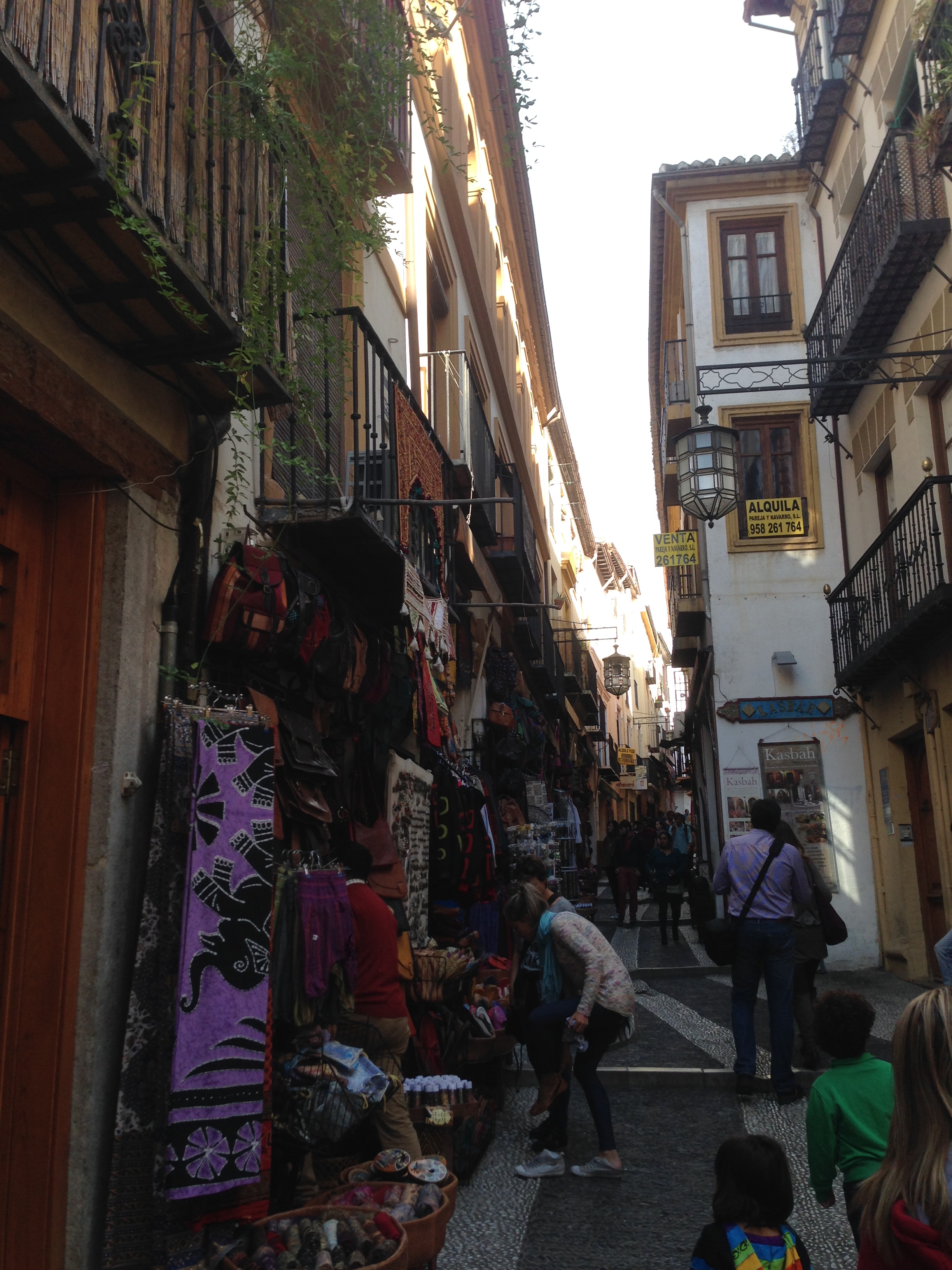 Muy bonito todo aunque ya bien cansados, era hora de bajar al centro para hacer nuestro último recorrido y buscar nuestras cosas en el hotel para irnos a Córdoba. Tomamos devuelta un bus para el centro y fuimos primero a buscar algo de comer. Fuimos a un lugar que nos habían recomendado por sus embutidos y que también tenían buenas paellas y comimos muy bien. Lo último fue dar una vuelta por el barrio de Albaicín ya que estaba lleno de tiendas con ropa gitana, por callecitas angostas en este barrio antiguo.